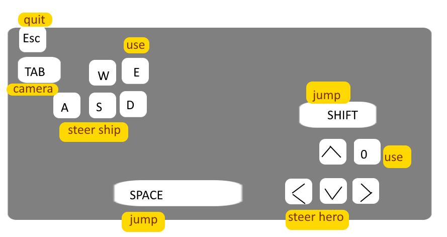 Game should be playable both by one person and by two person. So steering is little redundant. Either way You can control the ship and the hero simultaneously.